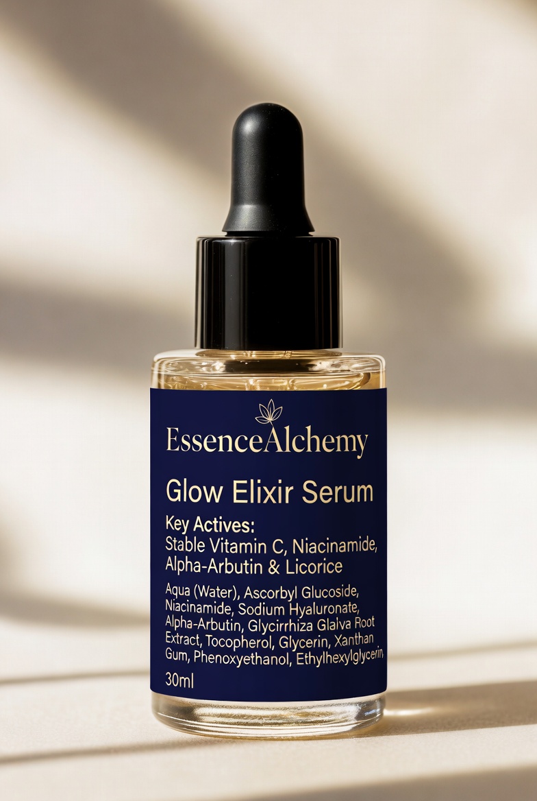 EssenceAlchemy Glow Elixir Serum is a radiant-boosting serum that combines stable Vitamin C with niacinamide and botanical extracts to brighten dull skin, fade dark spots, and promote an even, luminous complexion. Its silky texture absorbs quickly, delivering visible glow and improved skin clarity without irritation.